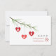 En bröllops-rsvp med en illustration av tre röda hjärtan som hänger från en tallgren. Personliggör med era initialer på hjärtat. Anpassa texten på framsidan och baksidan.