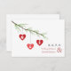 Ett bröllops-rsvp med en illustration av tre röda hjärtan som hänger från en tallgren. Personalisera med era initialer på hjärtat. Personalisera texten på framsidan och baksidan.