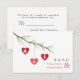 En bröllopsanmälan med en illustration av tre röda hjärtan som hänger från en tallgren. Personifiera med era initialer på hjärtat. Anpassa texten på framsidan och baksidan.