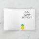 Pineappleicious är ett roligt födelsedagsgratulationskort för alla som älskar ananas. Det är dekorerat med en ananas i tecknad stil och insidan kan anpassas med ditt namn och hälsning. Kortet har en grön bakgrund med en gul ram och ananasen är i nyanser av gult och grönt.