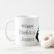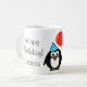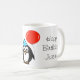 Pingvin födelsedagsmugg med röd ballong och namn. Personlig design med rolig pingvin tecknad figur som bär en festhatt och håller en ballong.