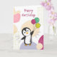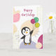 Födelsedagsgratulation Glad födelsedag med ballonger och pingvin för barns födelsedag. Ett roligt, färgglatt kort för ett barns födelsedag. För vänner som älskar pingviner.