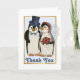 Detta söta pingvinpar är redo för sin bröllopsdag. Han ser elegant ut i sin topp och hon är söt i sin rosenaccentuerade brudslöja. Fru pingvin har en vacker bukett röda rosor. Texten på framsidan säger Tack. Matchande design på insidan.