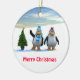 Är här två lyckliga pingvin som är all redo som firar helgdagar med deras dekorerade julgran.