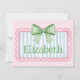 This cute note card features a pink frame with blue and white stripes and topped with a preppy green and white gingham plaid bow. Personalize with your choice of name or special text.
