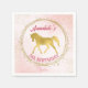 Pink and gold horse birthday party personalized name napkins with golden horse, gold circle, pink background.