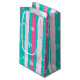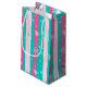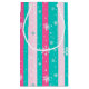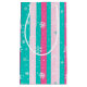 A cheery bright pink and aqua mint striped holiday pattern with playful white snowflakes and dots of snow