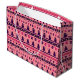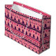 Festive trees, happy snowmen, and joyous symbols of the holidays in purple and magenta adorn this bright pink gift bag