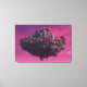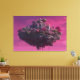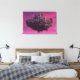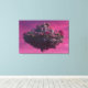 An ancient stone city overgrown with lush pink and crimson flowers floats gracefully among dramatic magenta clouds, its rocky underside draped with hanging vines and roots. Vibrant foliage contrasts beautifully with weathered architecture beneath a glowing pink sky, creating a serene yet magical scene of impossible beauty and quiet wonder. This surreal fantasy artwork is perfect for canvas prints, posters, phone cases, mousepads, throw pillows, tapestries, and décor that brings dreamlike adventure into any space.