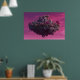 An ancient stone city overgrown with lush pink and crimson flowers floats gracefully among dramatic magenta clouds, its rocky underside draped with hanging vines and roots. Vibrant foliage contrasts beautifully with weathered architecture beneath a glowing pink sky, creating a serene yet magical scene of impossible beauty and quiet wonder. This surreal fantasy artwork is perfect for canvas prints, posters, phone cases, mousepads, throw pillows, tapestries, and décor that brings dreamlike adventure into any space.