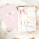 Pink bow girl's 2nd birthday invitation. Modern feminine design in blush pink and gold. Features trendy watercolor coquette bow, calligraphy heart script font and modern typography TWO. Perfect for an elegant style girl's second bday celebration. Personalize with your own details. Printed Zazzle invitations or instant download digital printable template.