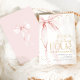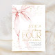 Pink bow girl's 4th birthday invitation. Modern feminine design in blush pink and gold. Features trendy watercolor coquette bow, calligraphy heart script font and modern typography FOUR. Perfect for an elegant style girl's fourth bday celebration. Personalize with your own details. Printed Zazzle invitations or instant download digital printable template.