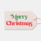 A curvy, modern retro font in Christmas red and green on a pink background covers the minimalist design of this Merry Christmas gift tag