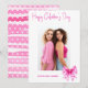 Pink coquette bow and hearts script Happy Galentine's Day Valentine's photo card. Send your Valentine's Day greetings to your best friend with this unique photo card. Your photo takes center stage, accompanied by a charming pink coquette bow with magenta hearts. The "Happy Galentine's Day" greeting is beautifully rendered in flowing script. The card's reverse delights with a vibrant, irregular pattern of pink stripes, animated by a scattering of hearts.