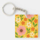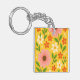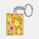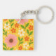 The design contains large pink flowers with soft rounded petals and a dark dotted center, surrounded by smaller flowers in orange and light cream colors. Slender branches with smooth green leaves connect the floral elements and add a natural flow. Small circular dots are scattered throughout the design, giving a light and cheerful touch. The background is a bright yellow tone that enhances the warm colors of the flowers and leaves. The overall style is simple and friendly, using flat shapes and clean colors to create a lively floral pattern.