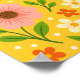 The design contains large pink flowers with soft rounded petals and a dark dotted center, surrounded by smaller flowers in orange and light cream colors. Slender branches with smooth green leaves connect the floral elements and add a natural flow. Small circular dots are scattered throughout the design, giving a light and cheerful touch. The background is a bright yellow tone that enhances the warm colors of the flowers and leaves. The overall style is simple and friendly, using flat shapes and clean colors to create a lively floral pattern.