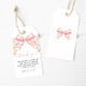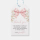 Elevate your modern, stylish baby girl shower celebration with these floral coquette themed thank you favor tags, featuring a pink watercolor bow surrounded by pink spring summer flowers.