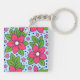 The design shows a repeating floral pattern with large stylized flowers in bright pink color. Each flower has wide smooth petals and a round cream-colored center with thin dark lines spreading outward. The flowers are surrounded by multiple green leaves with clear vein details, giving a fresh botanical feel. Small simple pink flowers are scattered throughout the design, adding extra decorative detail. Dark circular dots appear between the floral elements, creating visual rhythm and contrast. The background is light blue, which highlights the strong pink and green colors. The overall style is playful, clean, and illustrated with bold outlines and flat colors.