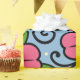 The design features large stylized flowers with rounded petals and a bright circular center. The flowers are drawn with thick black outlines that give them a clear, graphic look. Surrounding the flowers are smooth leaves with simple vein details, also outlined in black. Curved decorative lines and small dot-like shapes add a playful, flowing feeling to the design. The color palette includes strong pink for the flowers, fresh green for the leaves, warm yellow for the centers, and a calm light blue background. The contrast between the bold outlines and flat colors creates a lively and cheerful visual style with a slightly whimsical character.