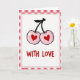 This Valentine's Day card shows two pink cherries side by side, each with a red heart shape in the center where the pit would be. The cherries look sweet and friendly, with small light spots that make them seem shiny. A thin black stem connects them at the top, making them feel like a close pair. The background is white, so the simple shapes and colors stand out clearly. Around the edges, there’s a pink-and-white gingham border that gives the card a cozy, homey frame. Under the cherries, the words “WITH LOVE” appear in red cursive-style lettering, centered near the bottom. Overall, it feels like a small, warm message of affection that fits a romantic or friendly note