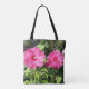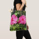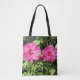 Drawstring backpack with bright pink hibiscus flowers photographed in a garden.