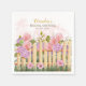 Elevate your bridal shower tablescape with these elegant pink lilac hydrangea napkins! Soft watercolor blooms in blush pink, lavender, purple, and blush tones cascade over a rustic picket fence with green leaves and delicate petals on a romantic white-pink wash background.