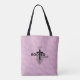 This cute Christian tote bag features a wavy pattern of giant lilac bubbles on a pink background. There is also a monochrome black illustration of a cross with roots and the tagline 'Rooted In Christ' - together with your own customizable initials above.