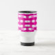 This travel mug features a striking geometric block pattern in alternating shades of pink, magenta, and white, creating a dynamic, contemporary design with a subtle three‑dimensional effect.
