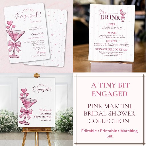 Celebrate the bride-to-be with this A Tiny Bit Engaged bridal shower invitation, featuring a chic pink martini glass illustration on the front and a soft heart-patterned back for an extra touch of charm. Designed in romantic blush tones with a fun cocktail theme, this invitation is perfect for stylish bridal showers and engagement parties.