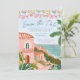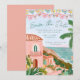 This destination wedding Save the date features painted artwork of a Mexican beach town scene with papel picado banners on top. All the important wedding details can be personalized. Colors include green, pink, blue, white and coral.