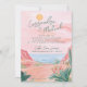 This destination wedding invitation features painted artwork of a Mexican desert beach scene. All the important wedding details can be personalized. Colors include green, pink, white and coral. Text in green.