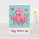 This card features a digital illustration of three stylized pink sea-creature characters cuddled close, with the larger one wrapping its tentacles around two smaller companions in a protective, affectionate pose ❤️. Their wide smiles and big blue eyes meet with a tender, friendly closeness that suggests family love without needing extra words. The trio sits against a cool aqua background, where deep pink heart shapes float nearby like little signs of affection. Soft shading and gentle gradients give the rounded shapes a bit of depth, and the tentacles curve smoothly with small orange‑pink suction details along the undersides. Near the bottom, a scalloped white border creates a neat space for the greeting, separating the characters from the message area. Centered on that white border, the words “Happy Mother’s Day” appear in burgundy lettering, easy to spot at a glance 🌼. The lower edge is finished with the white scallops and the burgundy text sitting neatly across the middle.