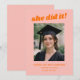 This graduation announcement features a bold retro "she did it!" headline in orange at the top, a full senior photo in the middle, and her name, school, and class year below — all on a soft pink background. A fun, colorful way to announce your daughter's graduation and share her big moment with family and friends.