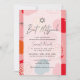 This stylish and kitsch Bat Mitzvah invitation features a pink background with a pomegranate pattern in red, orange and navy blue. The reverse side features a navy blue background with a pomegranate pattern. Personalize it for your needs. You can find matching products at my store.