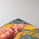 A square tile with a relief of a poppy flower in the center, set against a yellow and blue background. The poppy has large, pink petals that fan out at the top, with a gradient from pink to red near the center. The stem is green and extends down to a bud at the bottom, which is surrounded by green leaves.