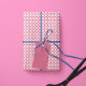 Wrapping paper roll with a classic preppy gingham pattern with little hearts. For a variety of occasions ranging from Valentine's Day, anniversaries, birthdays, or just because. Shown in pink but available in more colors.