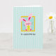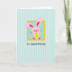 This card features a stylized pink bunny 🐰 with rosy cheeks, tiny black dot eyes, and fine black whiskers, looking straight ahead with a gentle, friendly expression. Bright fuchsia details color the inner ears and paw pads, adding a cute contrast to the soft pink body. The bunny’s front paws cradle a lemon-yellow oval decorated with small sky-blue polka dots, like a little gift held close in a caring hug. Behind the character, a golden-yellow square frame surrounds a calm sky-blue panel, giving the central scene a tidy, focused look. The outer background is pale mint green with slightly uneven vertical white stripes that resemble a softly painted texture. Beneath the framed illustration, a short line of text sits centered in warm orange, written in flowing cursive-style lettering. The pastel palette and the bunny’s tender, holding posture give the design a sweet, affectionate tone 🌷. The golden frame, blue panel, and dotted yellow oval stand out crisply against the mint-and-white striped backdrop.