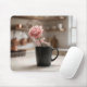A pink rose adorned with a pink bow rests inside a wire whisk, which is placed in a black mug on a white kitchen countertop, with a blurred kitchen background