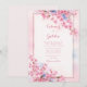 Surround your wedding details with the ethereal and painterly beauty of this watercolor botanical masterpiece. This design features vibrant pink cherry blossom clusters with delicate hand-painted petals cascading across the top and bottom corners. Artistic splashes of periwinkle blue watercolor bleed softly into the dreamy pink background wash, creating a whimsical and romantic atmosphere. A thin, minimalist bronze frame provides a sharp, modern boundary for your text, beautifully contrasting with the soft-focus floral elements. This high-definition composition captures a serene spring garden vibe, perfect for couples seeking a unique, fine-art aesthetic. This watercolor botanical scene is a premier choice for a romantic spring wedding, a whimsical garden ceremony, or an elegant outdoor reception. It pairs beautifully with themes like ethereal romance, modern organic, or cottagecore, and coordinates perfectly with bronze metallic accent, soft pink linen, and white floral decor.