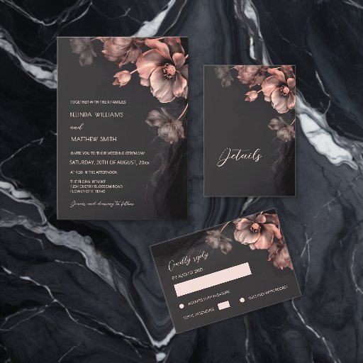 Pink shiny metallic floral details enclosure card. With a headline in an elegant handwritten script.