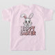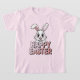 This t-shirt is made of pre-shrunk 100% ComfortSoft® cotton. The t-shirt features a comic illustration of a happy Easter bunny with a pink background. The bunny has a white body, long white and pink ears and a cheerful expression with rosy cheeks and a cute smile. The bunny's hands are positioned on top of pink text that reads HAPPY EASTER. The text has a black outline and shadow. The bunny's eyes are large and black with white highlights, and it has small black whiskers. The bunny's nose is pink, and its feet are white. The illustration has a cute, child-friendly style with neat lines and soft colors. The pink background is a solid color. The t-shirt has shoulder-to-shoulder taping with a cover stitched collar. The t-shirt has double-needle stitched armholes and sleeves.