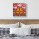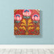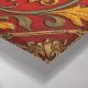 Three pink lotus flowers with blue pistils and yellow leaves on a red background with a golden frame, art nouveau style.
