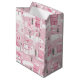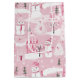 A snow covered Christmas village with on a pink background, dotted with adorable snowmen and green trees.