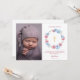 Blå och rosablommig baby dop tackkort. Har en krans av akvarell peonior och bebisfoto. Matchande föremål finns.