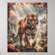En majestätisk piony tiger vandrar genom en kejserlig trädgård där styrka möter blomsterluksus. Realistisk tigeranatomi smälter samman med lager på lager av pionyblad, eleganta blad, djärva ränder och rika botaniska texturer över dess kraftfulla kropp. Mjukt solljus, drivande blommor, stenvägar och dimmig trädgårdsarkitektur skapar en filmisk lyxig miljö. Denna slående fantasidesign tillför drama, elegans och självförtroende till moderna interiörer, kontor, sovrum eller exklusiva presentkollektioner. Perfekt för tigerälskare, lyxdekorfans och samlare av blomsterdjurskonst.
