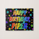 Denna spännande och livliga pusseldysdesign med födelsedag har budskapet "GRATTIS PÅ FÖDELSEDAGEN, PIPER", med tecknen som har ett färgstarkt regnbågsspektrum som inspirerar gradienten mönster, tillsammans med ett vibrerande fält av stjärnornas bakgrund mönster. Ett så pass dynamiskt pussel kan vara ett roligt sätt att skicka födelsedagstävlingar till någon som heter Piper. [~Z0000468]