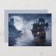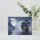 Pirat frakt som seglar förbi ett slott med fullt måne på en dimmig natt