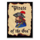 Linda Baysinger Pecks målning av en pirat-kapten, på parkeringsbakgrunden. Texten lyder "Pirat i havet". Underbara kort för dem som njuter av renaissance och sviktande äventyr. © Linda Baysinger Peck Med reserverade Höger