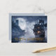 Piratskepp seglar förbi ett slott med fullmåne på en dimmig natt