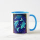 Mug in a Pisces illustration featuring two turquoise blue fish swimming in opposite directions against a starry, deep blue background. A crescent moon and stars enhance the celestial theme, evoking the imaginative spirit of the Pisces zodiac sign.